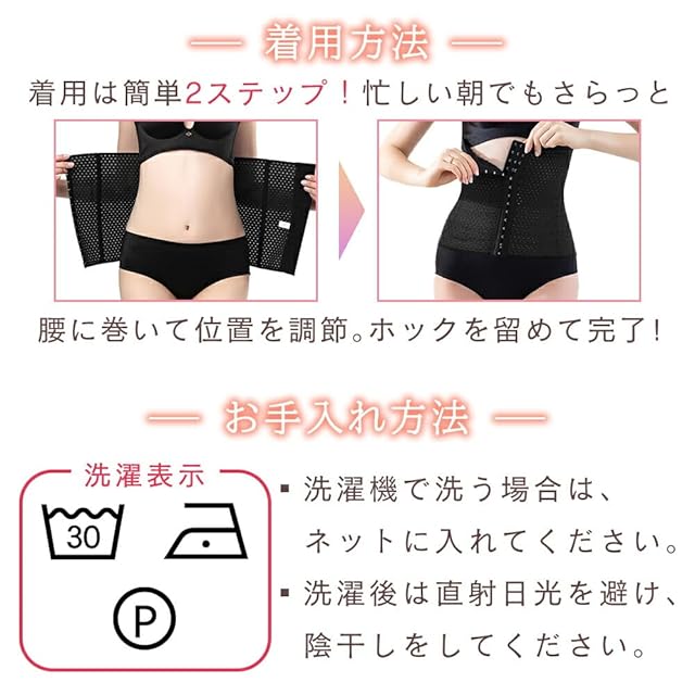 【ホック式でサイズ調整も簡単】 フロントは3段階ホック式でウエストの締め具合を細かく調節でき、体型や日によって異なるフィット感を自由にコントロール可能。体調や体型の変化があっても無理なく対応できるから、ダイエット中や産後ケア時にも活用しやすい。着脱も前開きだから簡単で、初めてでも扱いやすい構造。外出先でもサッと装着できて、着替えやお手洗い時のストレスも軽減。動きやすさと使いやすさを両立した実用的なデザインが魅力