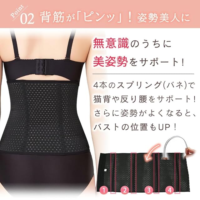 【姿勢サポート構造で背筋もシャキッと】 背中側に4本のスプリングボーンを内蔵することで猫背や反り腰などの姿勢を自然にサポートし、美しい姿勢を保ちやすくなる設計。長時間のデスクワークや立ち仕事、育児や家事などの日常動作でも背筋が自然と伸び、無意識のうちに姿勢改善をアシスト。姿勢が整うことで見た目もスマートに引き締まって見え、バスト位置が上がってスタイルアップ効果も。ファッションに自信が持てるようになり、毎日の生活にも前向きな気持ちをプラス