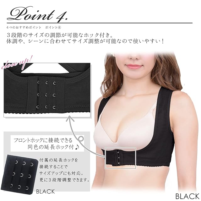 フロントホックは3段階のサイズ調整が可能で脱着も簡単。本体と同色の延長ホックを付属しているので接続することでサイズアップにも対応。