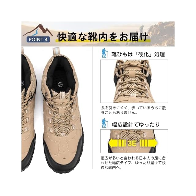 高耐久性で過酷な環境にも対応 登山やハイキング、キャンプなどの厳しい環境にも対応できる高耐久性の登山靴。高品質なラバーソールと強化レザーを使用し、岩場や泥道でも長持ちします。アッパー部分は高い強度を誇り、登山や山登りでも足元をしっかり守ります。過酷な環境でも長時間使用でき、アウトドアやハイキングに最適です。
