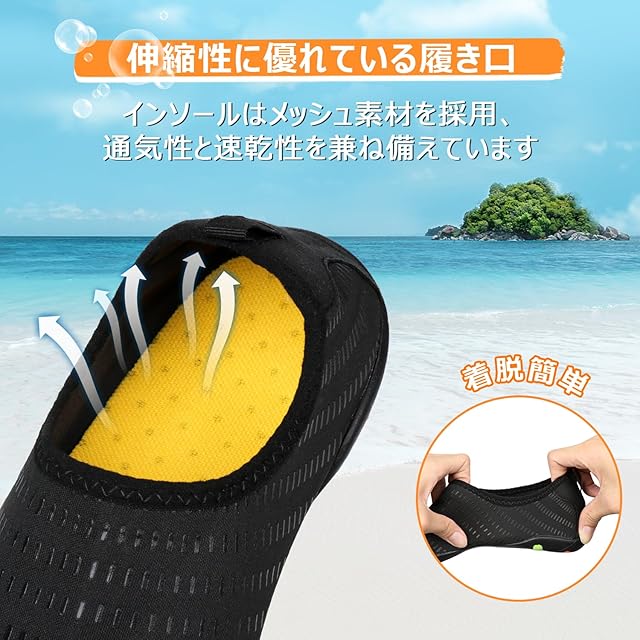 【着脱簡単】ウォーターシューズの履き口は伸縮性があり、着脱が簡単です。足首周りのフィット感が高く、まるで裸足のような快適な履き心地です。※ピッタリとした着用感がお好みの場合は、ワンサイズ小さいものがおすすめです。