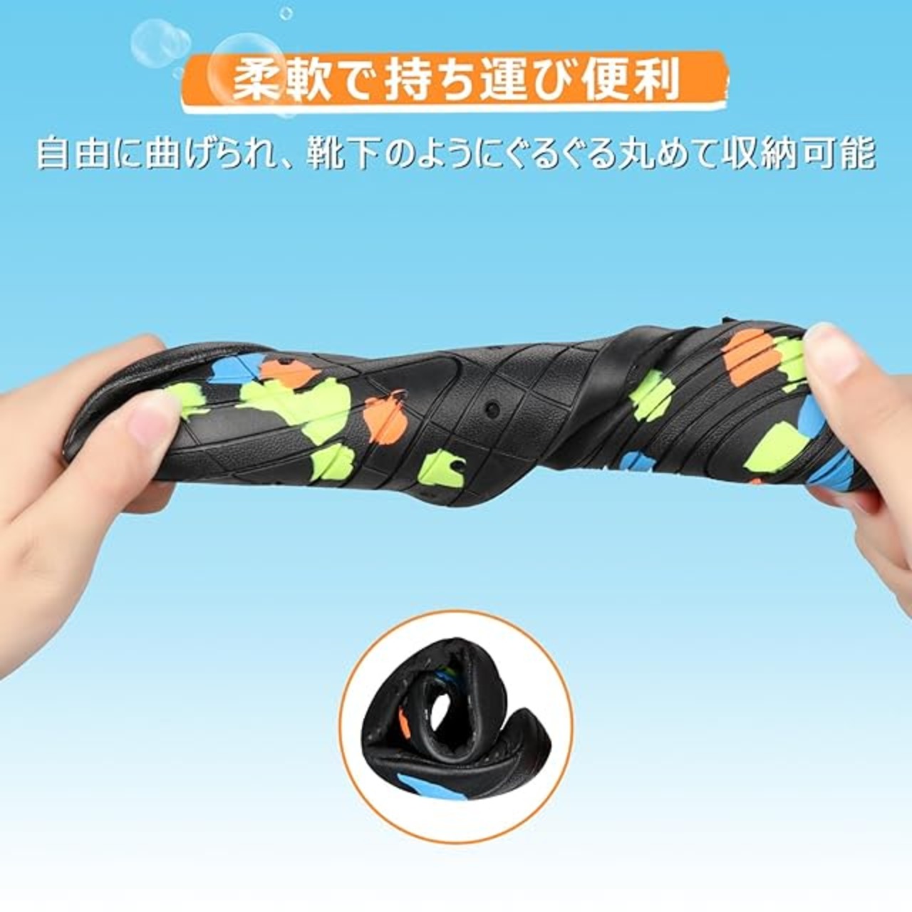 【柔らかくて持運び便利】ビーチシューズは曲げやすい柔らかい素材で作られており、靴下のように丸めて収納することも可能です。