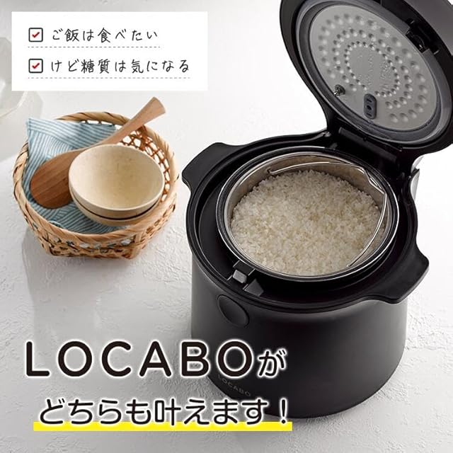 LOCABOの一番の特徴である糖質カットを実現したのは、その構造です。 一般的な炊飯器では、お米を炊いた際にお米から発生する糖質(でんぷん)が水と一緒にお米に付着しています。 そこでLOCABOはお米から発生した糖質(でんぷん)がお米に付着しないように、蒸し器のような構造にしています。これによって、炊飯時に発生した糖質(でんぷん)を落とすことが可能になりました。 サイズ 奥行22cm × 横25.5cm × 高さ22cm 重さ 約2.3kg 炊飯容量 糖質カット炊飯2合 / 通常炊飯5合 /玄米5合/ 炊き込み4合 機能 糖質カット炊飯(ふつう・やわらかめ) 通常炊飯(ふつう・やわらかめ) 玄米炊き込み スチーム(蒸し料理用) 再加熱 保温 予約炊飯