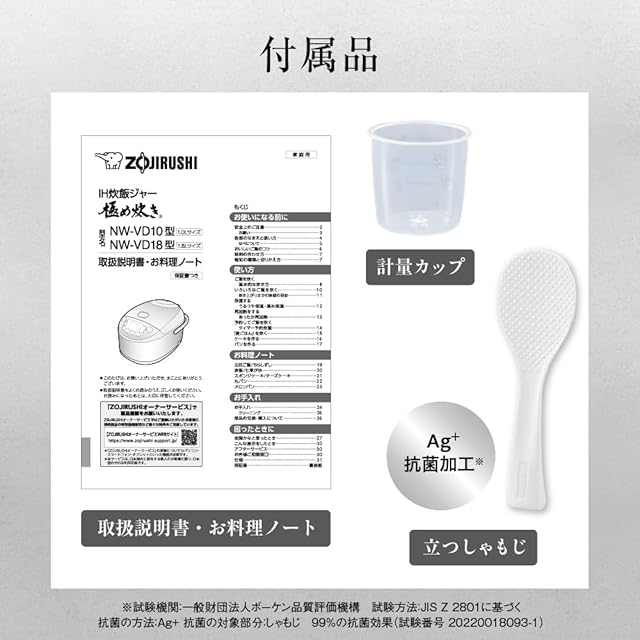 1升炊き 強火で炊き続け、うまみを引き出す「豪熱沸とうIH」 ふつう やわらかめ かためと炊き方が選べる「白米炊き分け3コース」 30時間おいしく保温できる「うるつや保温」 より無洗米がおいしく炊ける「無洗米」メニュー 幅×奥行×高さ(mm):【外形寸法】280×405×245【ふた開き時の高さ】470 質量(kg):5.0 カラー:ブラック(BA) 炊飯時消費電力(W):1295 1回あたりの炊飯時消費電力量(Wh):215 1時間あたりの保温時消費電力量(Wh):20.1 炊飯容量(白米):0.18~1.8L(1升) 年間消費電力量(kWh):127.1(エコ炊飯) メーカー品番:NW-VD18