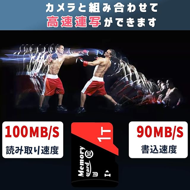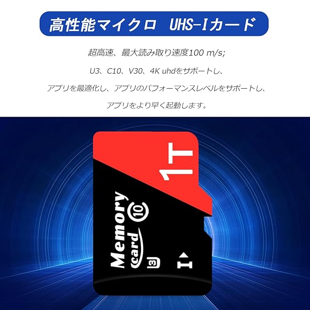 容量:1Tメモリーカード。<br> 外形寸法: 15×11×1mm。<br> 動作温度: -25℃~85℃ : 耐温度、防水、耐磁、耐X線、静電耐性<br> カードタイプ: CLASS10 UHS-I U3 V30<br> 最高100MB/秒の読み取り速度でメディアを転送する時間を短縮します。ホストデバイス、インターフェース、使用状況などの要因によって転送速度が低下する場合があります。<br> スマートフォン、タブレット、デジタルカメラ、4Kゲーム機などで使用できます。<br> データ復旧サービスがありませんので重要なデータをバックアップする作業に気をつけてください。