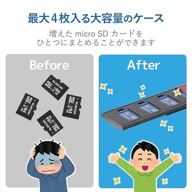 薄くコンパクトなスティックタイプでスマートにmicroSDカードを4枚収納する事が出来ます。