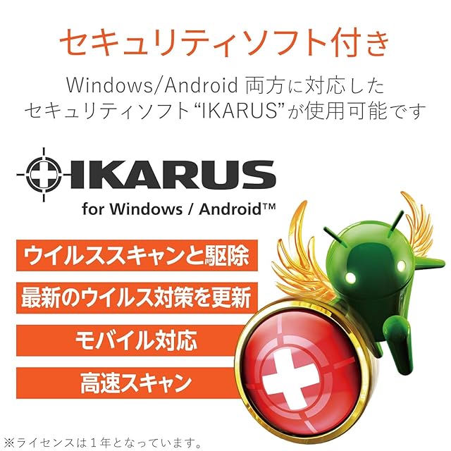 様々なウイルスからタブレットを守るセキュリティソフト“IKARUS(イカロス)”の1年版ライセンスが付いています。Windows版とAndroid版が付いており、それぞれの端末で利用可能です。