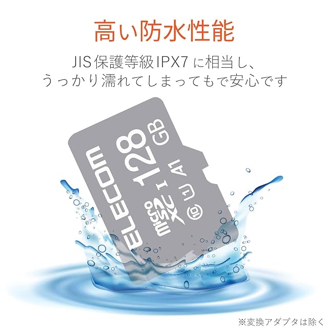 「JIS防水保護等級7(IPX7)」に準拠し、メモリカードの交換時などにうっかり水に濡れてしまっても安心の防水仕様です。※変換アダプタは防水ではありません。