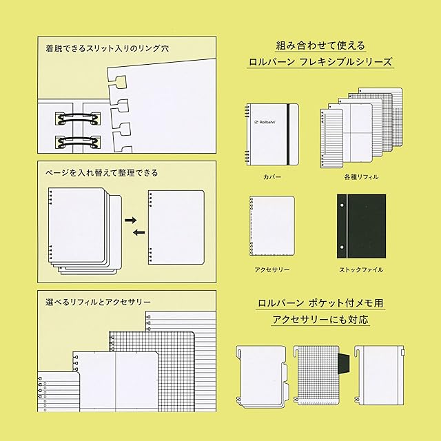 自分好みのダイアリーが作れる、ロルバーン フレキシブル専用ダイアリーリフィル(マンスリータイプ(フリーマンスリー))</br> ページを入れ替えられるロルバーン、「ロルバーン フレキシブル」のカバーにセットして使えるダイアリーリフィルのマンスリータイプ。日付を書き込んで使えるフリー形式で、見開き左に月間カレンダーを配置できます。</br> マンスリーリフィルは、裏面が5mm方眼メモになっているため、A5サイズの「ロルバーン フレキシブル」のカバーにセットすると、見開きの左ページがマンスリー、右ページが方眼メモになる機能的な構成。</br>日付の記載はなく、自由に書き込んで使用可能。忙しい月のみ使うなど、ライフスタイルに合わせて活用できます。</br>用紙は、通常の「ロルバーン ポケット付メモ」と同様、クリーム色でインクがにじみにくく裏移りしにくい上質紙です。</br>取り外しや付け替えの際に一年を通して使用しても破れにくくするため、紙はやや厚くなっています。</br>「ロルバーン フレキシブル」は、ページ毎に分類し直して、思考を整理・整頓することを習慣化するためのシリーズです。</br>他リフィルの方眼メモ、罫線メモ、ミーティング、4分割、TO DO、ダイアリーとして使用できる日付入りのマンスリータイプ、日付を書き込むフリー形式のホリゾンタルタイプ、</br>各月の指定がないフリー形式のログチャートタイプ、ガントチャートタイプ、名刺や資料、シールなど細かなものを一緒に持ち運べるクリアポケットと組み合わせるのもおすすめ。</br>タイプ別のリフィルやアクセサリーを組み合わせて、自分に合った一冊を作ることができます。</br>リフィルをセットする際は、スリット入りのリング穴で、本体の上下にある各4つのリングから取り外し、付け替えが可能。</br>リングから取り外す場合には、一度に3枚程度をまとめてリフィルの上下どちらかの端を垂直に引き上げてリングから外します。</br> 1パッケージにつき、12ヶ月分の13枚入り。自分好みのカスタマイズが可能です。</br>一回り小さいLサイズ用もあります。ライフスタイルや好みに合わせた一冊をお使いください。