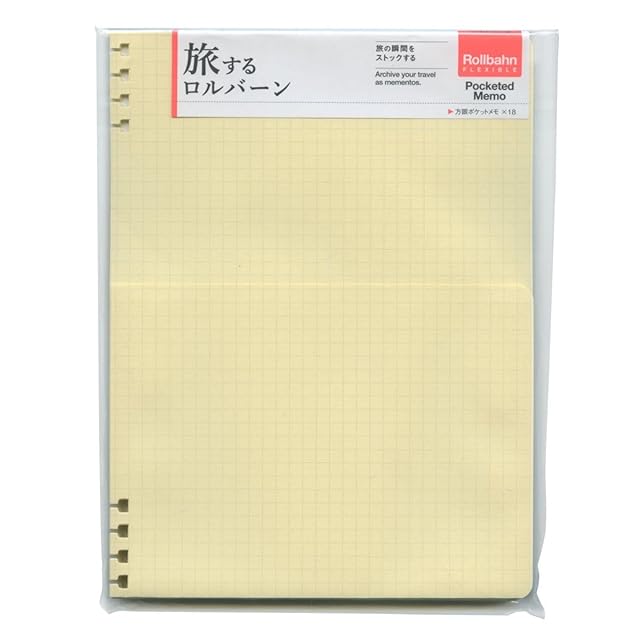 【18枚入り】書くだけでなく、チケットやチラシなどの紙物を収納できる紙製ポケットリフィル(ポケット片面)</br> ページを自由に入れ替えられる特徴を活かしたロルバーン フレキシブルの新しいアイテム、</br>旅をしながら保存やメモをすることで、その瞬間を記録できる「旅するロルバーン」のリフィルが加わりました。</br>方眼メモの片面がポケット仕様になっています。</br> 旅は、いつもと違う感覚や視点を与えてくれるもの。何気なく手に取ったもの、感じたことなど、その瞬間を留めたストックがいつか人生を変えるきっかけやヒントになるかもしれません。</br>文具に造詣が深く、自身も“旅のかけら”をストックして楽しんでいるフリーアナウンサーの堤信子さんをアドバイザーに迎えて開発。</br>こちらのアイテムは、旅先で出会うものやことをそのままストックしていくと完成する、誰でも簡単に作れるノート「旅するロルバーン」のリフィルとして登場しました。</br>インクのにじみや裏写りも気にならないクリーム色の上質紙。</br>旅で手にしたチケット、パンフレット、レシート、ショップカードなどをポケット部分に入れて収納できるほか、方眼メモとして、スケジュールや目的地、その瞬間に感じたことを書くのにも最適です。</br>きれいに仕上げることを意識せず、旅先でさっと取り出して、旅の感覚のまま加えて作っていくノートです。</br>リフィルは一度に3枚程度をまとめて、スリット入りのリング穴を「ロルバーン フレキシブル カバーL」の上下にある各4つのリングにセットして使います。</br>リングから取り外す場合には、リフィルの上下どちらかの端を垂直に引き上げてリングから外します。</br> 1パッケージにつき、18枚入り。サイズは、A5サイズです。</br>「旅するロルバーン」のリフィルは、他に紙物を貼る、スタンプを押すなど、スクラップブックのように使用できる3色アソートの無地リフィルもあります。</br>数種類のリフィルを常備して、用途に合わせて書き分けるのがおすすめ。</br>一回り小さなB6に近しいLサイズ用もあります。</br> ※リフィルは薄い紙物などを収納、貼り付けることを想定しています。重量のある物を収納、貼り付けるとリフィルに負荷がかかり、破れる原因となります。