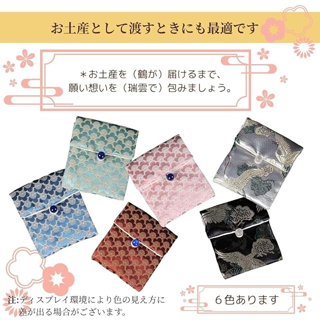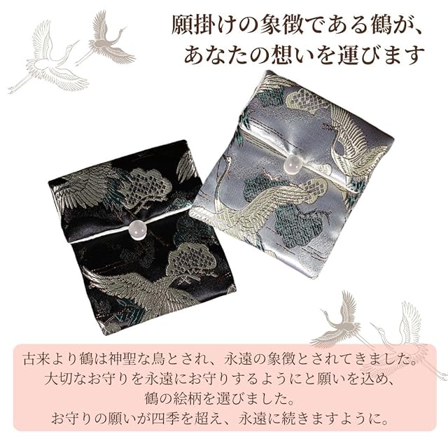 鶴は願いを運び、瑞雲は想いを包みます<br /> 「大切な想いを守るための、お守り専用ケース」<br /> 縁起の良いお守りを大切にして、さらに願いを届けたい<br /> 旅先で購入した大切なお守り、鞄にそのまま入れて困ったことはありませんか?<br /> また旅先で数珠やパワーストーンを外すとき、入れ物に困ったことはありませんか?<br /> 柔らかな内布のお守り袋があれば、お守りを優しく包み、他の小物も一緒に収納可能。<br /> バッグの持ち手に取り付ければすぐに取り出せる便利さも^^<br /> プレゼントやお土産にも選ばれる上品な素材と可愛らしいデザインで、贈り相手にあなたの想いを届けます。<br /> 大切な想いを守るために、あなたの毎日に寄り添う一品です。<br />