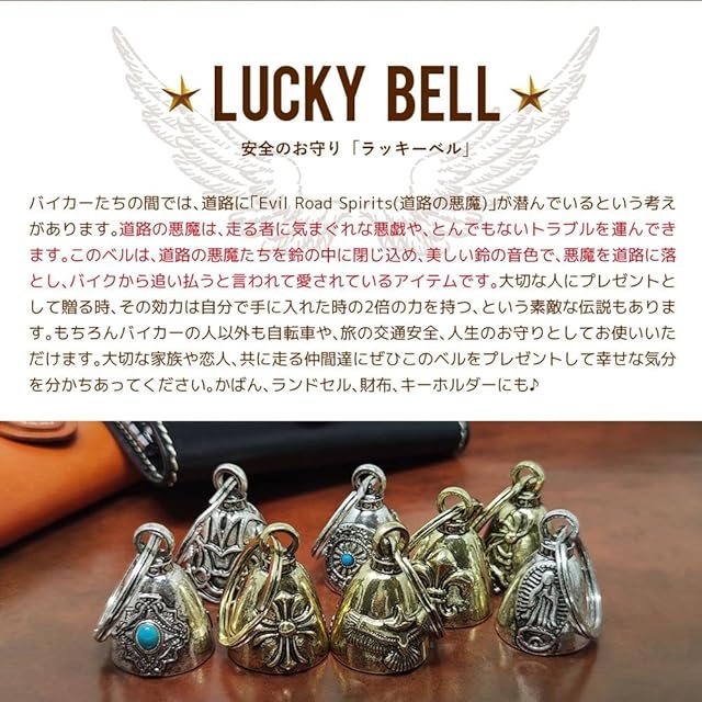 バイカーたちの間では、道路に「Evil Road Spirits(道路の悪魔)」が潜んでいるという考えがあります。道路の悪魔は、走る者に気まぐれな悪戯や、とんでもないトラブルを運んできます。このベルは、道路の悪魔たちを鈴の中に閉じ込め、美しい鈴の音色で、悪魔を道路に落とし、バイクから追い払うと言われて愛されているアイテムです。