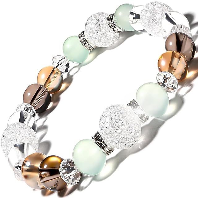 【パワーストーン・天然石】シンプルで飽きの来ないデザイン、複数のパワーストーンはシンプルなデザインの中にも存在感があり、幅広い年齢層にお使いいただけます。【使用している天然石・パーツのサイズ一覧】約10mm / 8mm ムーンストーン 約10mm / 6mm カット水晶 約8mm スモーキークォーツ 約8mm クラックオーラ 約8mm ゴールデンオーラ 約6mm ロンデル(メタルパーツ) 【重さ】約20g ※こちらの商品は一点一点手作業で仕上げておりますため、石のサイズや色合い、重さに若干の個体差が生じる場合がございます。あらかじめご了承ください。