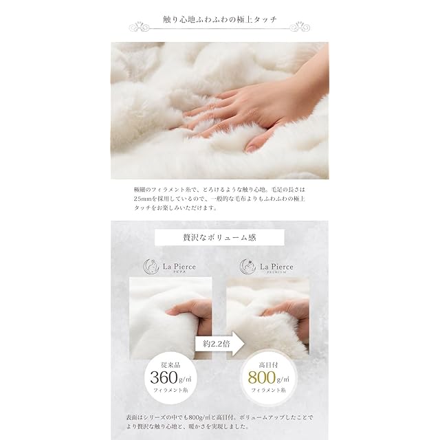 【とろけるような肌触り】極細のフィラメント糸で、とろけるような触り心地です。毛足の長さは25mmを採用しているので、一般的な毛布よりもふわふわの極上タッチをお楽しみいただけます。 表面はシリーズの中でも高目付。ボリュームアップしたことでより贅沢な触り心地と、暖かさを実現しました。中綿なしでも生地に重みがあり、暖かいのでブランケットとしてもお使いいただけます。