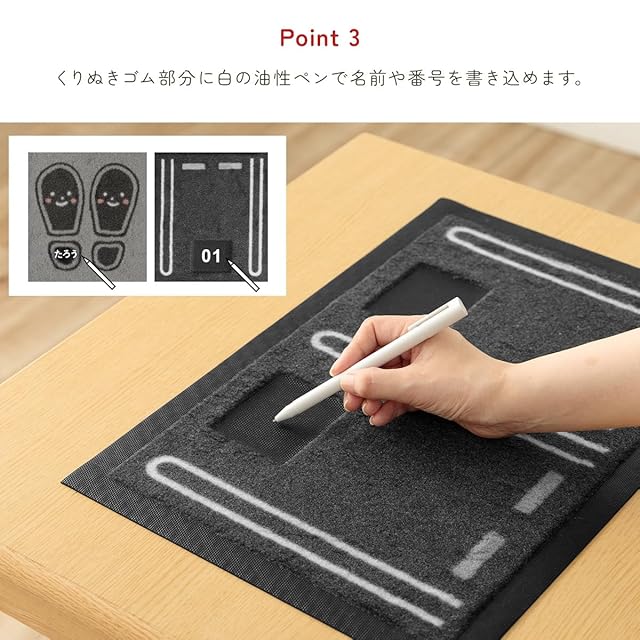 【商品紹介】お子様の靴揃え教育にぴったり!自分の置き場を決めることで、靴を揃えたくなるマットです。くりぬきゴム部分に白の油性ペンで名前や番号を書き込めます。