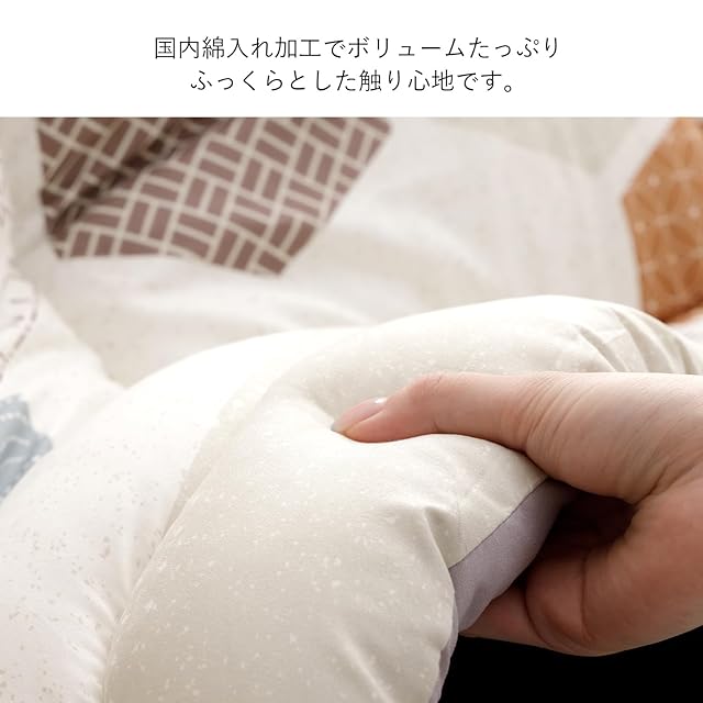 【日本製の品質】国内の工場で熟練の職人が1枚1枚丁寧に綿入れ加工をしています。中綿は「東レ マッシュロン綿」を使用し、ボリュームたっぷりでふっくら。しっかりと温かさを保ちます。