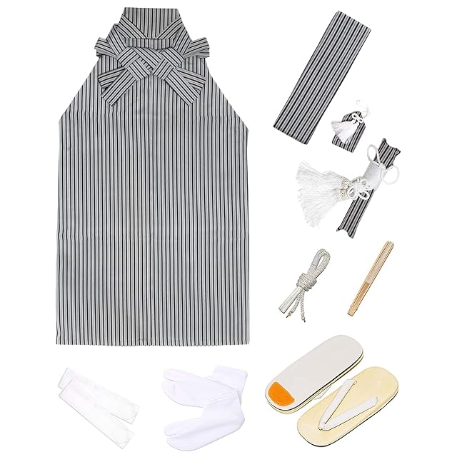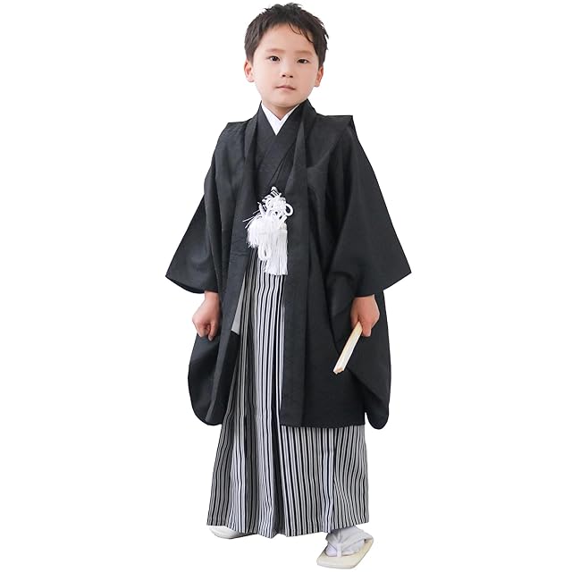 [セット内容]:着物/羽織/縞黒袴/襦袢/履物/角帯/扇子/懐剣/羽織紐/お守り/足袋/腰紐2本/着付け説明書 [品質と素材]:ポリエステル100%、[生産国]:中国