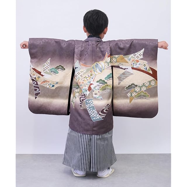 商品名:[KYOETSU] [キョウエツ] 羽織袴セット 七五三用 5歳用 絵羽 吉祥文様 フルセット(着物、羽織、縞黒袴、襦袢、履物、角帯、扇子、懐剣、羽織紐、お守り、足袋、腰紐2本) ボーイズ ((03)熨斗目-灰+黒縞)