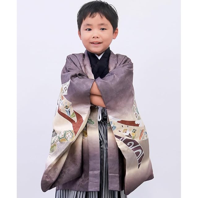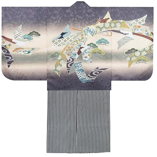 [KYOETSU] [キョウエツ] 羽織袴セット 七五三用 5歳用 絵羽 吉祥文様 フルセット(着物、羽織、縞黒袴、襦袢、履物、角帯、扇子、懐剣、羽織紐、お守り、足袋、腰紐2本) ボーイズ ((03)熨斗目-灰+黒縞)