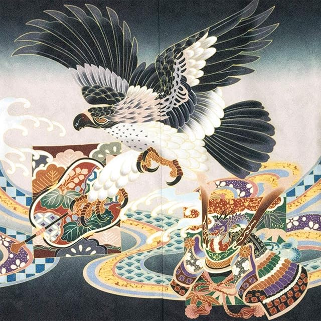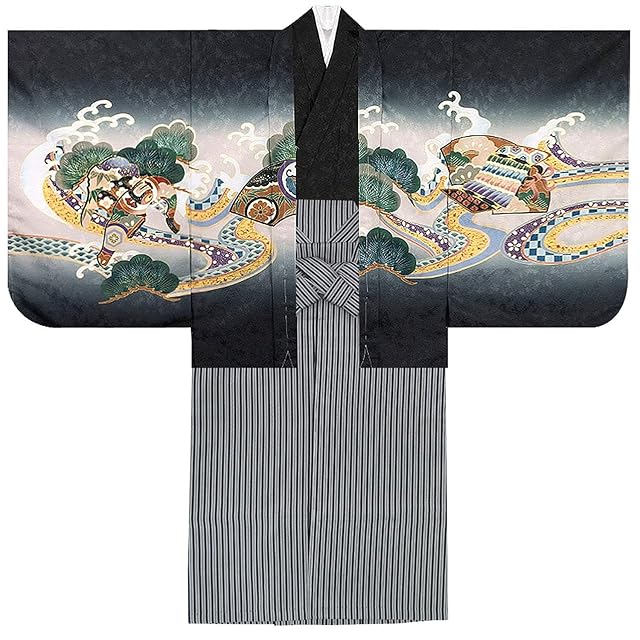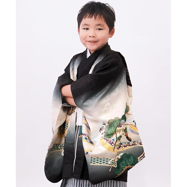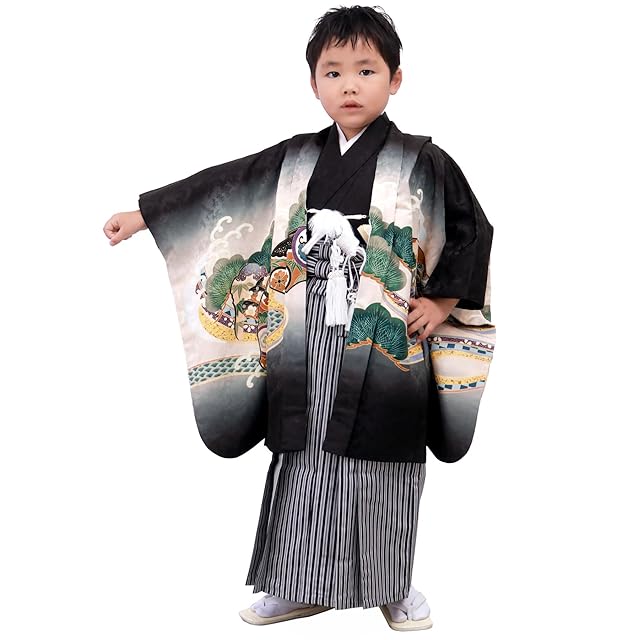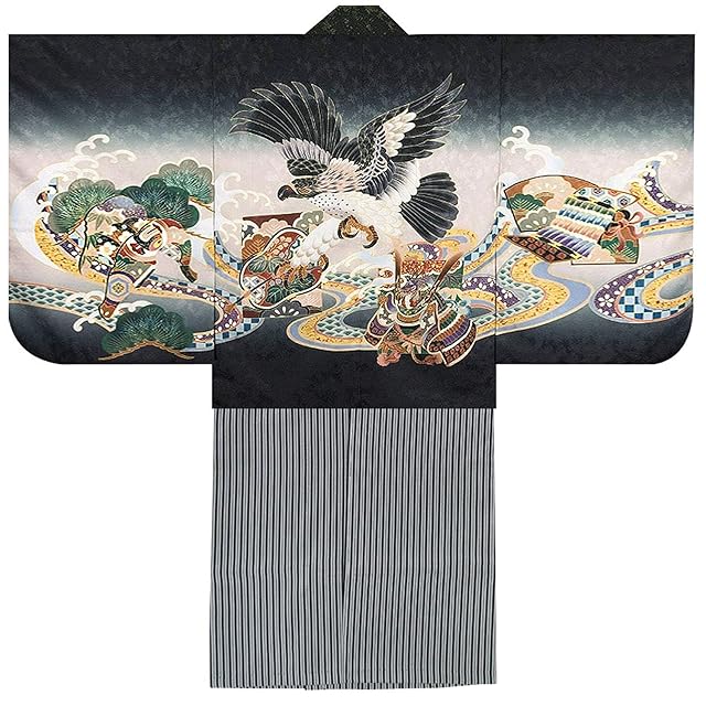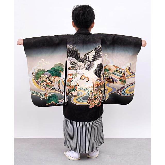 [KYOETSU] [キョウエツ] 羽織袴セット 七五三用 5歳用 絵羽 吉祥文様 フルセット(着物、羽織、縞黒袴、襦袢、履物、角帯、扇子、懐剣、羽織紐、お守り、足袋、腰紐2本) ボーイズ ((07)鷹兜-黒+黒縞)