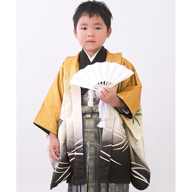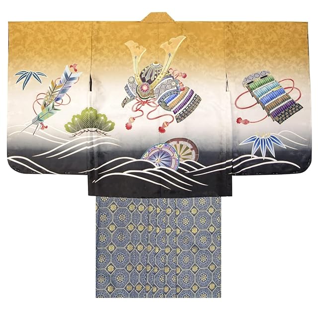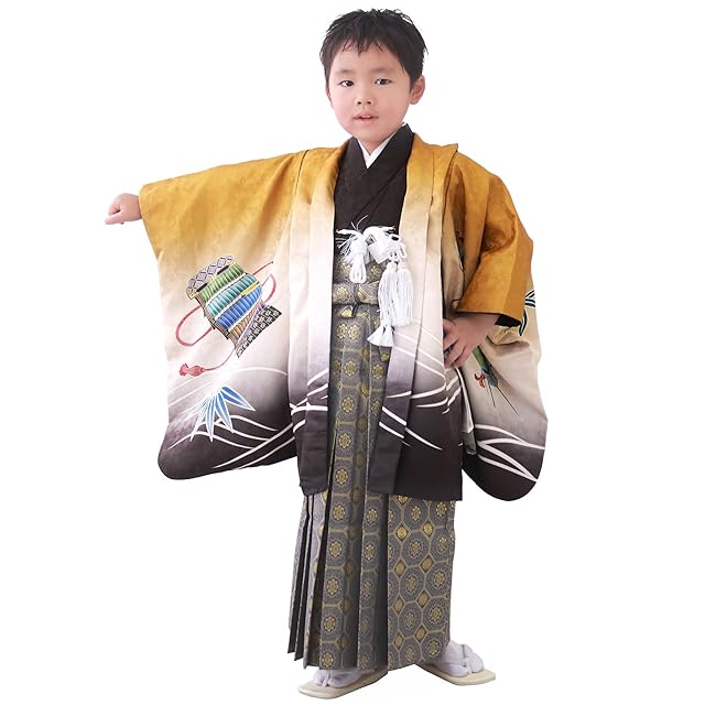 [KYOETSU] [キョウエツ] 七五三 5歳 男の子 着物 セット 羽織 袴 フルセット 753 絵羽 A ((15)兜-金茶+藍鼠)