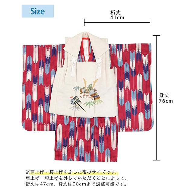 【肩上げ・腰上げ済】子供の着物はこれからの成長を願って肩上げ・腰上げするのが通例です。3歳の標準サイズに合わせて寸法調整済なので、90cm~100cmくらいのお子様であればお直しなしでご着用いただけます。簡単にほどいていただけるので、ご家庭でお子様のサイズに合わせて調整いただくことも可能です。