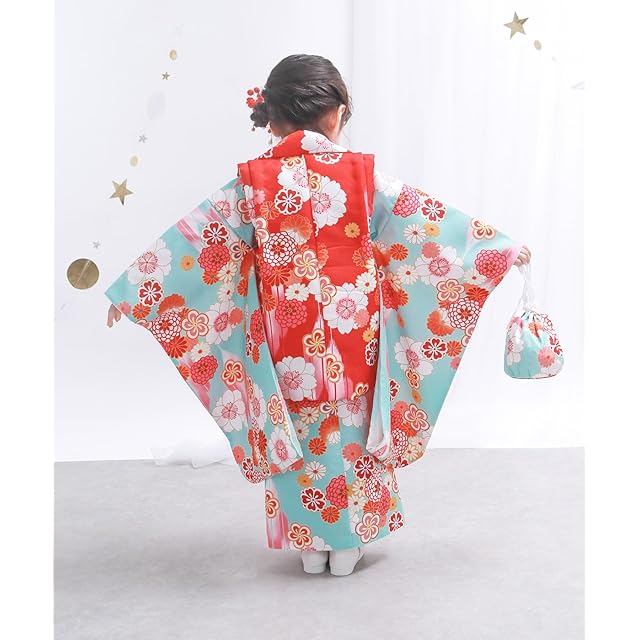 届いてすぐに着れる被布セット。 ※着物は肩上げされていません。袖が長い場合は肩上げをするか、被布で隠れる部分を安全ピンなどでつまんで調整してください。 被布/着物/伊達衿(縫い付け済み)/巾着 ※モデル画像内の髪飾りや足袋、靴などはセットに含まれません。