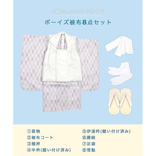 七五三の男の子の3歳のお祝いに。着付けに必要なものはすべて揃っているおしゃれな被布セットです。