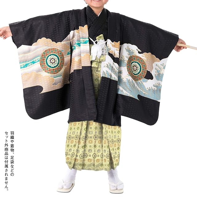 晴れの日の子供の羽織姿にぴったり! 華やかな柄や縁起の良い柄をあしらった 子供用の柄入り袴と小物の7点セットです。 ※袴が紐下55cmの場合の雪駄サイズは約18.5cm、袴が紐下60cmの場合の雪駄サイズは約19.5cmになります。