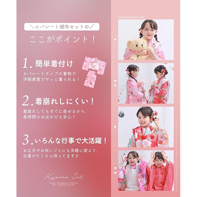 3歳女の子の七五三お祝いに。 もっと簡単に着用できる二部式タイプ登場。 セパレートだから洋服感覚でサッと着られる!