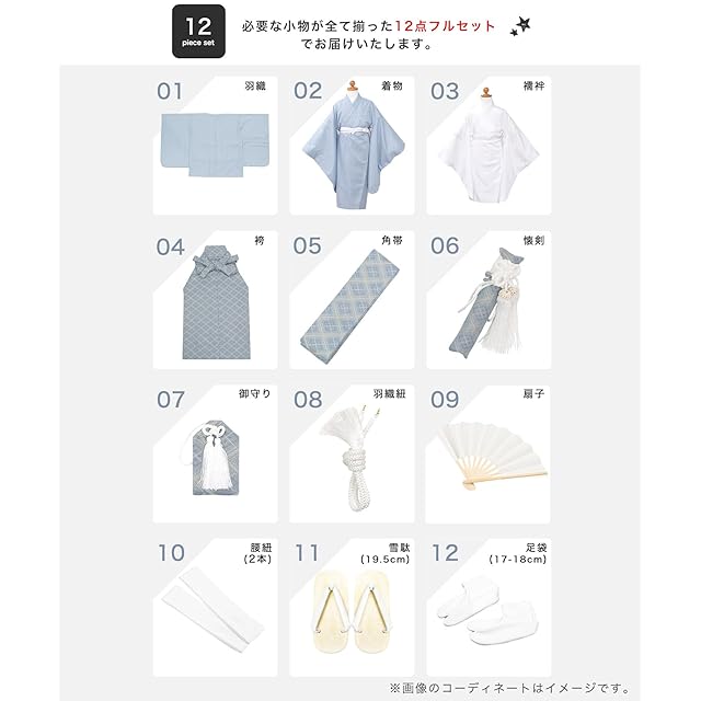 [セット内容]:着物/羽織/縞黒袴/襦袢/履物/角帯/扇子/懐剣/羽織紐/お守り/足袋/腰紐2本/着付け説明書 [品質と素材]:ポリエステル100%、[生産国]:中国