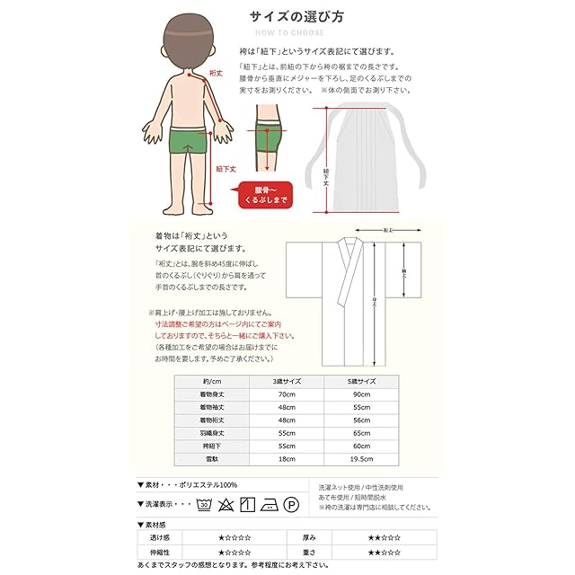 [5歳サイズ]: 着物身丈90cm/着物袖丈55cm/着物裄丈56cm/羽織身丈65cm、袴紐下:60cm、足袋:17-18cm