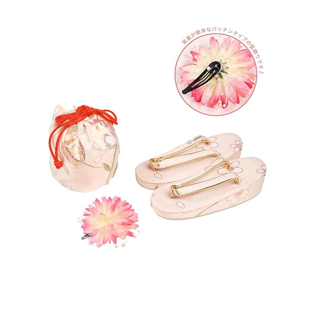 髪飾りや巾着、草履など含めて9点のフルセットなので、これだけで必要なものがすべて揃います。はじめての方でも簡単にできる着付けの説明書をお付けいたします。