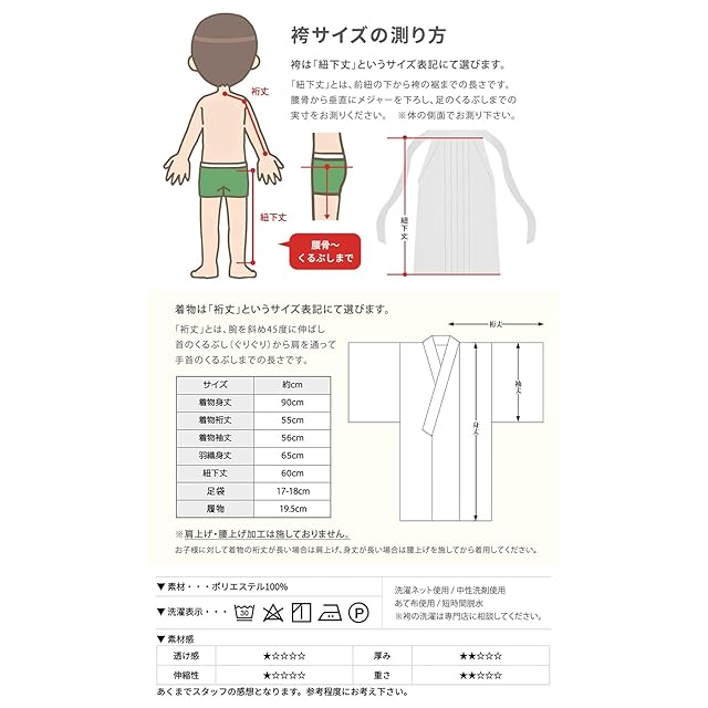 [サイズ]:着物:身丈90cm 裄丈55cm 袖丈:56cm、羽織:身丈65cm、袴:紐下60cm、履物:19.5cm、足袋:17-18cm