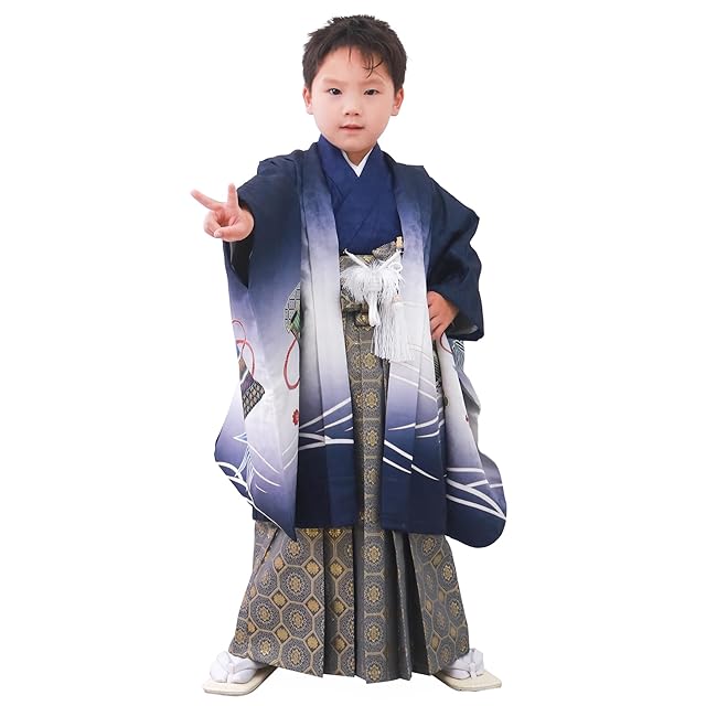 七五三を迎える5歳の男の子への成長祝いにおすすめの着物と袴のセットです。 着用に必要な12点がそろっているので、他に小物をそろえる必要なし!ご家庭で着付けていただけるよう、着付けの説明書もご案内しております。 【着付けの説明書について】商品の外袋に貼られているQRコードを読み取っていただくと、着付けの説明書をご覧いただけます。 [セット内容]:着物/羽織/袴(行灯タイプ)/襦袢/履物/角帯/扇子/懐剣/羽織紐/お守り/足袋/腰紐2本 [サイズ]:着物:身丈90cm 裄丈55cm 袖丈:56cm、羽織:身丈65cm、袴:紐下60cm、履物:19.5cm、足袋:17-18cm [品質と素材]:ポリエステル100%、[生産国]:中国