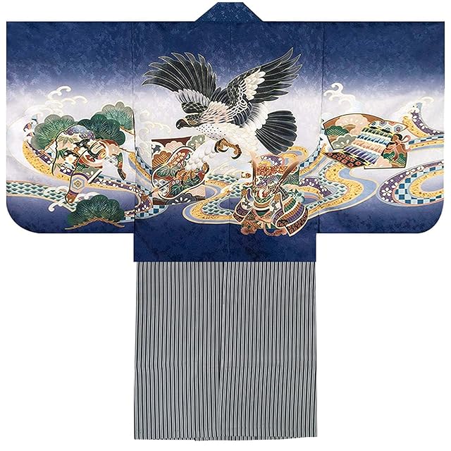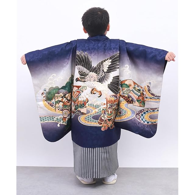 [KYOETSU] [キョウエツ] 羽織袴セット 七五三用 5歳用 絵羽 吉祥文様 フルセット(着物、羽織、縞黒袴、襦袢、履物、角帯、扇子、懐剣、羽織紐、お守り、足袋、腰紐2本) ボーイズ ((08)鷹兜-紺+黒縞)