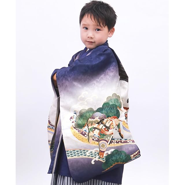 商品名:[KYOETSU] [キョウエツ] 羽織袴セット 七五三用 5歳用 絵羽 吉祥文様 フルセット(着物、羽織、縞黒袴、襦袢、履物、角帯、扇子、懐剣、羽織紐、お守り、足袋、腰紐2本) ボーイズ ((08)鷹兜-紺+黒縞)
