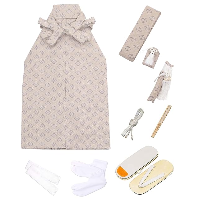 [セット内容]:着物/羽織/縞黒袴/襦袢/履物/角帯/扇子/懐剣/羽織紐/お守り/足袋/腰紐2本/着付け説明書 [品質と素材]:ポリエステル100%、[生産国]:中国
