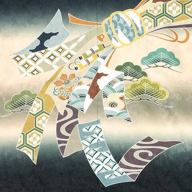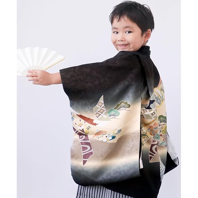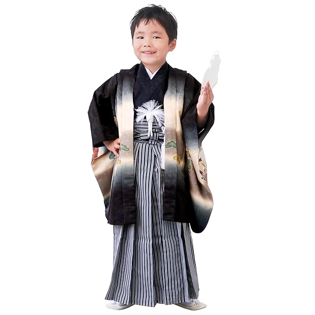 [KYOETSU] [キョウエツ] 羽織袴セット 七五三用 5歳用 絵羽 吉祥文様 フルセット(着物、羽織、縞黒袴、襦袢、履物、角帯、扇子、懐剣、羽織紐、お守り、足袋、腰紐2本) ボーイズ ((01)熨斗目-黒+黒縞)