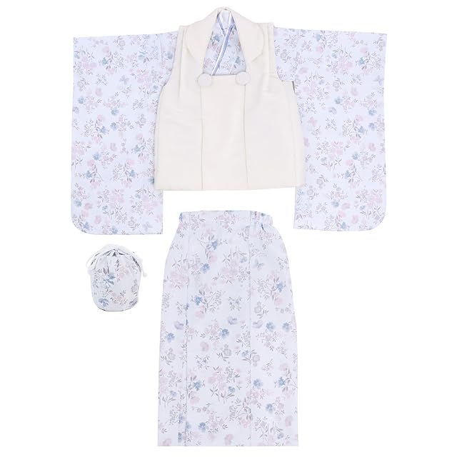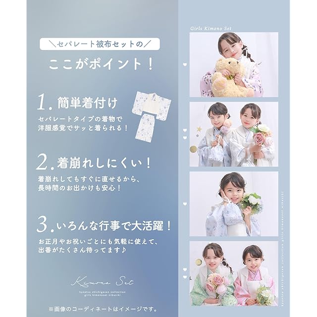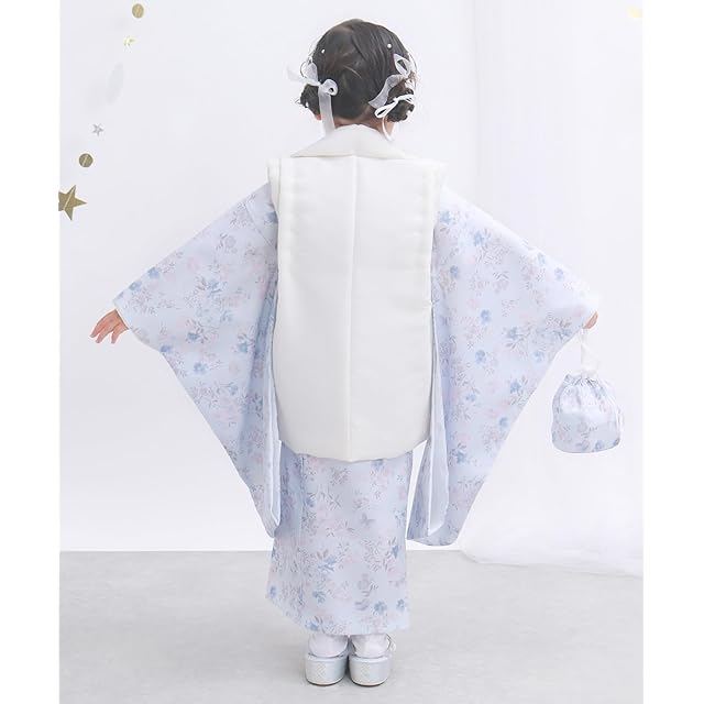 商品名:[KYOETSU] [キョウエツ] 自宅で簡単着付け 七五三 3歳 女の子 着物 セパレート 二部式 セット 被布 小物 フルセット 753 4点セット くすみ (8.蒼の花夢, 90-100cm)