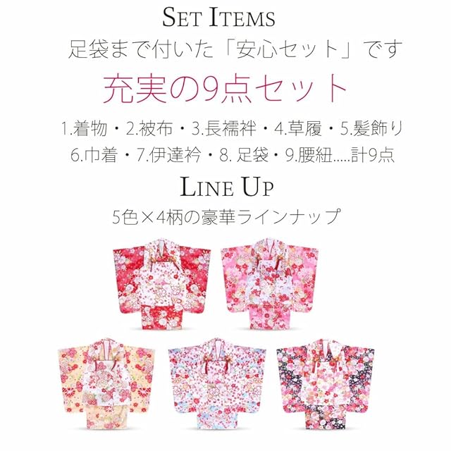 [セット内容]:被布/着物/伊達衿/長襦袢/髪飾り/巾着/草履/腰紐/足袋/専用化粧箱
