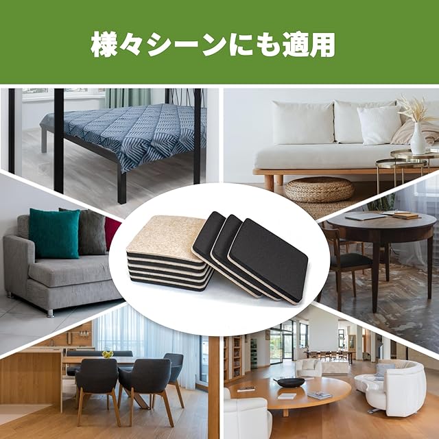 【簡単設置】フェルトの表面は、耐久性と耐磨耗性に優れ、床との摩擦による騒音を抑えられ、床をキズから保護できます。黒い面を上、ブラウンの面を下にして、家具の下に床保護マットを設置します。よりしっかりとホールドし、重さを均等に分散させるために、傷防止マットは家具の脚を中心に設置します。