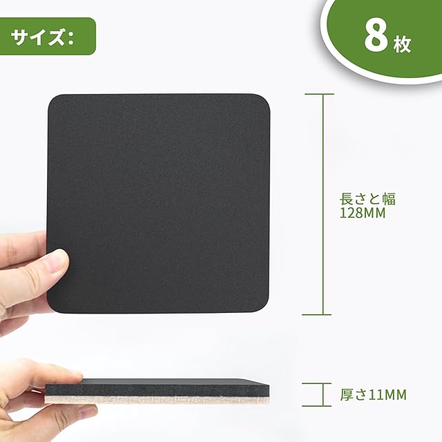 【製品仕様】◆辺の長さ:127mm ◆セット内容:8枚のフェルトタイプ(厚さ:11mm) ◆素材:フェルト、EVA ◆耐荷重:60kg。辺の長さ127mmである家具移動パッドは、何の形状やサイズの家具の脚にも適用します。8枚入りで2つのテーブルに使えます。