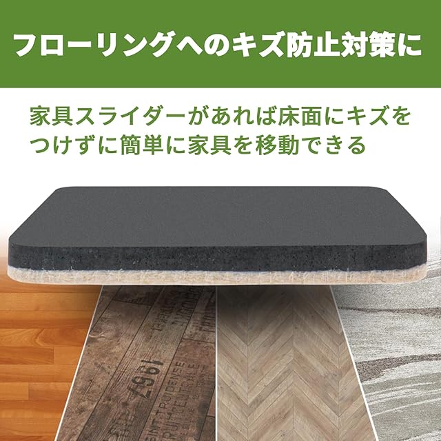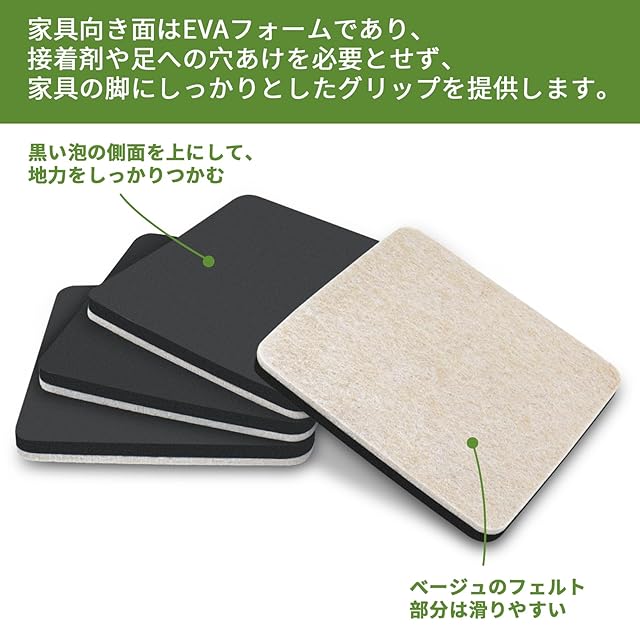 【高品質】耐磨耗性のあるフェルトを採用して作られた家具スライダーが頻繁に家具に使用しても大丈夫です。家具向き面はEVAフォームであり、ソフトで床への圧力を減らします。高品質素材を使用しており繰り返し利用することができます。当社のウッドフロア用スライダーには、厚手のフェルト、ゴムフォームを使用しています。 硬材用のスライダーの上部に接着部はありません。ゴムのフォームが家具をしっかりとずれないように固定しますので、長時間維持されます