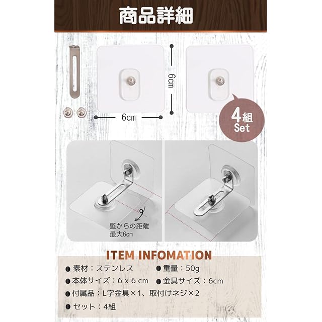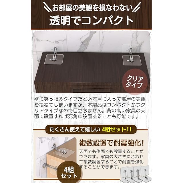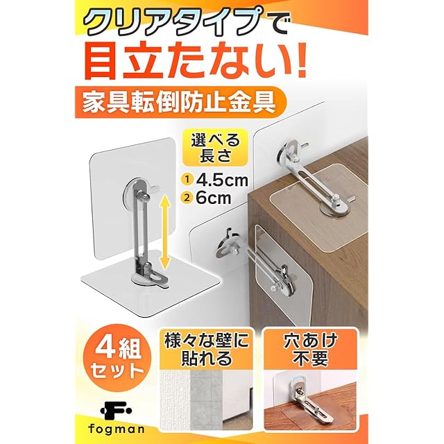 商品名:fogman 家具 転倒防止 穴開け不要 目立たない クリア 金具 棚 賃貸 地震対策 4組セット (金具6cm)
