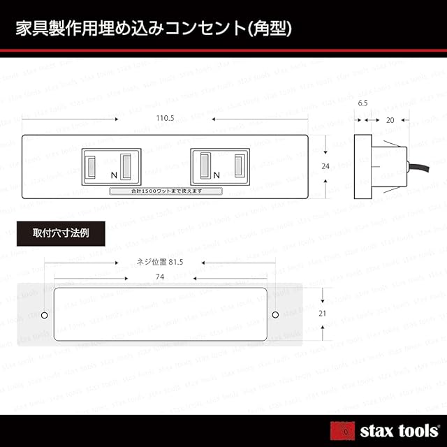 DIY 木工 コンセント シンプル 【stax tools】 家具製作用 埋め込みコンセント 2つ口(角型)(ブラウン)