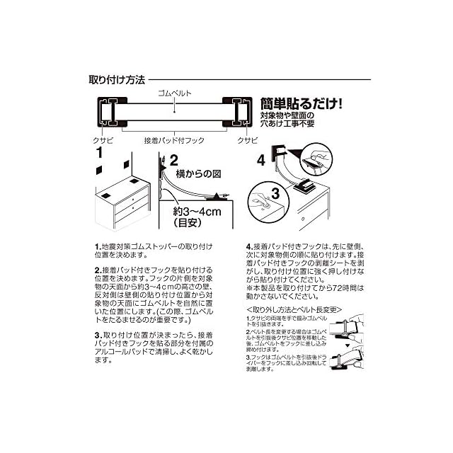 地震対策ゴムストッパー 【セット内容】接着パッド付フック+ゴムベルト×2本、アルコールパッド×2枚