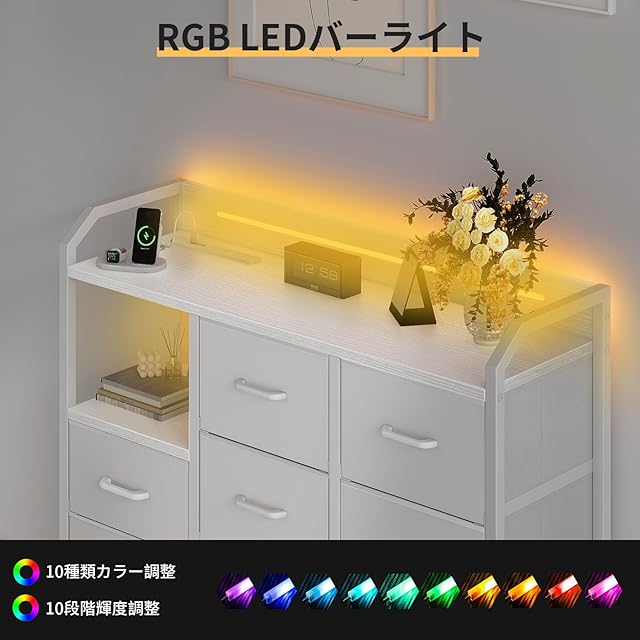 【調整可能なLEDライトストリップでムードを演出】収納チェストの上部には調整可能なLEDライトを搭載。10つのモード、10色、そして8段階の明るさ調整が可能で、生活の雰囲気に合わせて自由に設定できます。夜間でも静かな空間でリラックスでき、化粧台としても最適です。