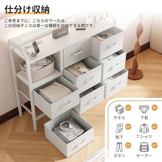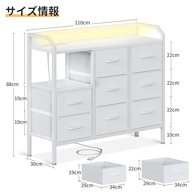 商品名:AODK タンス チェスト 衣裝ケース 収納ケース 衣装棚 洋服収納 led付き 引き出し8杯付き コンセント付き 脱衣所 棚 衣類チェスト 洋服タンス 箪笥 たんす 木製天板付き 和風 リビング 安定感 大容量(ホワイト, 幅110×奥行30×高さ88cm)