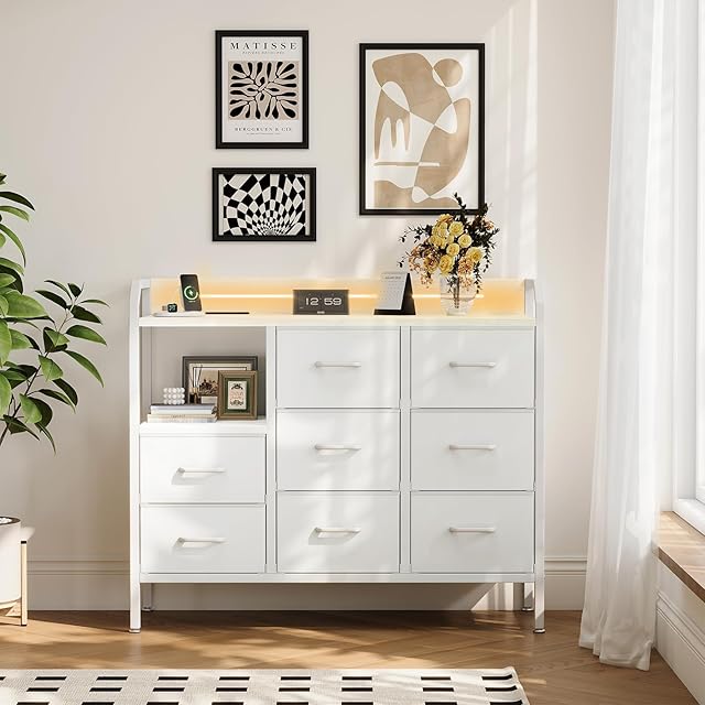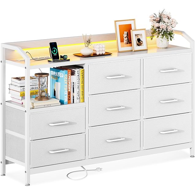 AODK タンス チェスト 衣裝ケース 収納ケース 衣装棚 洋服収納 led付き 引き出し8杯付き コンセント付き 脱衣所 棚 衣類チェスト 洋服タンス 箪笥 たんす 木製天板付き 和風 リビング 安定感 大容量(ホワイト, 幅110×奥行30×高さ88cm)